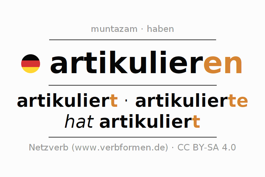 artikulieren feʼlining oʻzgarishi (aniq talaffuz qilish, aniqroq ifodalamoq) muntazamdir. Asosiy shakllar: artikuliert, artikulierte va hat artikuliert. artikulieren uchun yordamchi fe’l "haben" hisoblanadi. artikulieren fe’li refleksiv tarzda ishlatilishi mumkin. Faolda turlanadi va Asosiy gap sifatida ishlatiladi. Yaxshiroq tushunish uchun artikulieren fe’lining son-sanoqsiz misollari mavjud. Mashq qilish va mustahkamlash uchun artikulieren uchun bepul ish varaqalari ham mavjud. Siz faqat artikulieren fe’lini konjugatsiya qilish emas, balki barcha nemis fe’llarini ham konjugatsiya qilishingiz mumkin. Fe’l Zertifikat Deutsch yoki C2 darajasi lug‘atining bir qismidir. Izohlar ☆