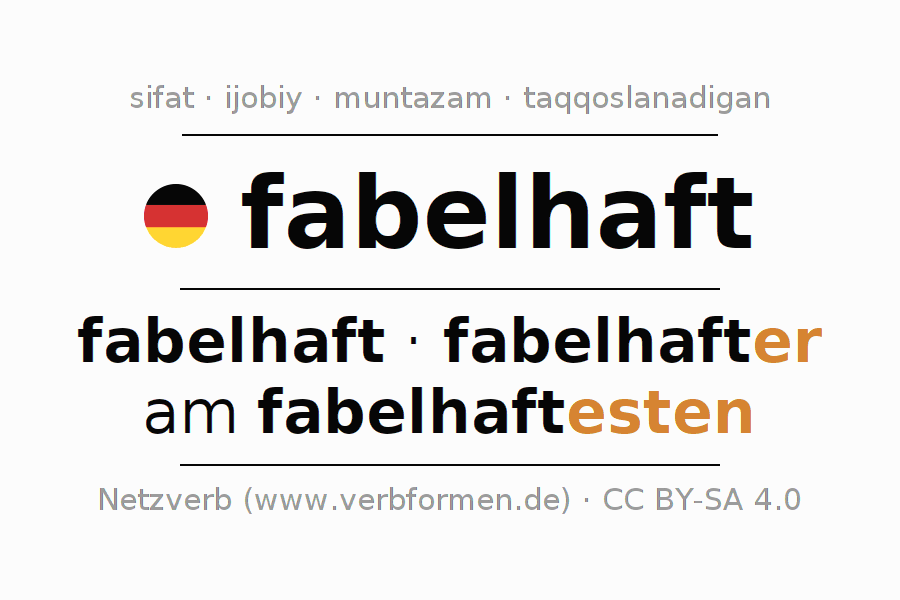 fabelhaft sifatining otlanishi (afsonaviy, ajoyib) taqqoslash shakllaridan foydalanadi fabelhaft,fabelhafter,am fabelhaftesten. Taqqoslashning qiyosiy va eng yuqori darajalari uchun qo‘shimchalar er/esten hisoblanadi. fabelhaft sifatini ham ot oldida aniqlovchi sifatida, ham fe’l bilan birga predikativ tarzda ishlatish mumkin.Bu yerda nafaqat fabelhaft ni turlantirish va taqqoslash, balki barcha nemis sifatlarini ham bajarish mumkin. Izohlar ☆