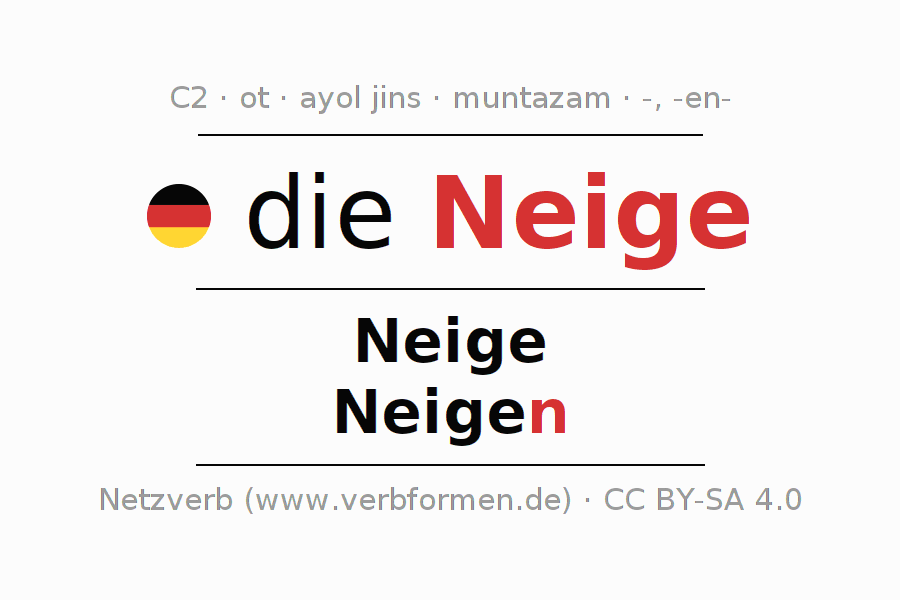 Neige so‘zining egalik, ko‘plik va to‘rt holatda (nominativ — 1-holat, genitiv — 2-holat, dativ — 3-holat, akkusativ — 4-holat) barcha shakllari jadvalda ko‘rsatilgan. Bu jadval uy vazifalari, imtihonlar, maktabda nemis tili darslari, universitet, chet yoki ikkinchi til sifatida nemis tili va kattalar ta’limi uchun foydalidir. Nemis tilini o‘rganuvchilar uchun Neige so‘zining to‘g‘ri egalik shakli juda muhimdir. Batafsil ma’lumotni Wiktionary Neige va Neige Duden’da topishingiz mumkin.